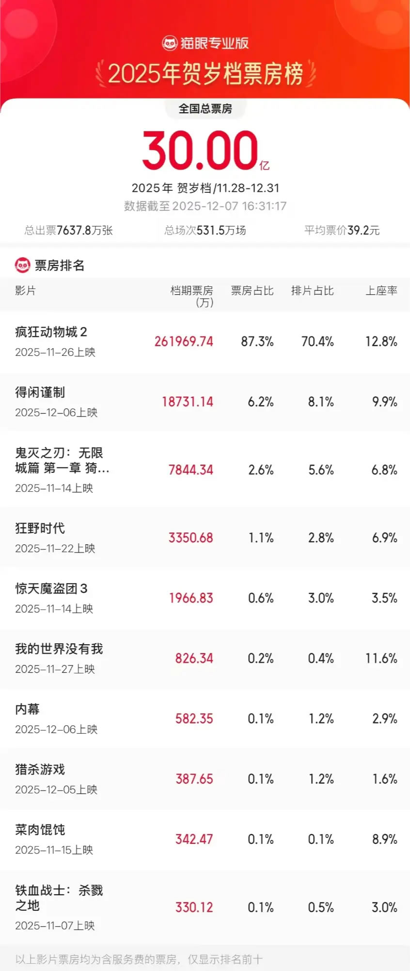 央广网北京12月8日消息(记者冯仪)据猫眼专业版数据,截至12月7日16时31分,2025年贺岁档档期(11月28日-12月31日)总票房破30亿,《疯狂动物城2》持续领跑贺岁档票房榜。