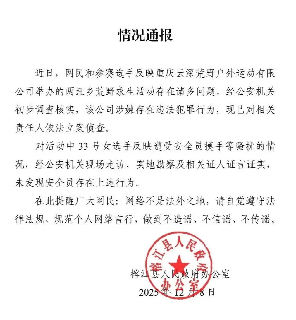 央广网黔东南12月9日消息(记者杨贇)据“榕江发布”微信公众号12月8日晚消息,贵州省榕江县通报两汪乡荒野求生赛事相关情况:主办方企业涉嫌违法犯罪行为,责任人被警方立案侦查,多方查证女选手被安全员骚扰为不实消息。