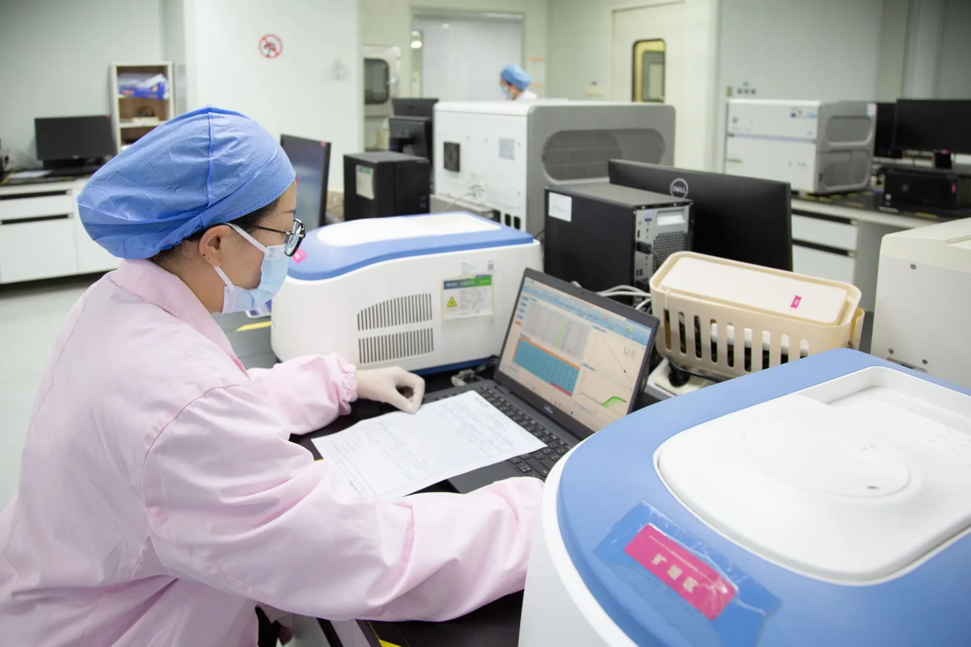 迪安诊断实验室内工作人员正在对核酸扩增结果进行分析(央广网记者 杨正弘 摄)