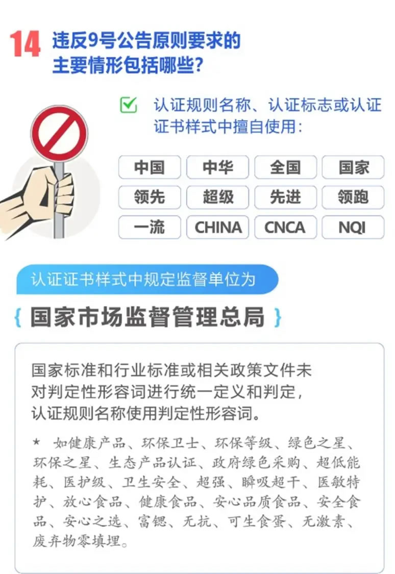 9月,市场监管总局认证监管司发布了《认证规则备案常见问题解答》,其中列举了违反《公告》原则的具体情形,包括国家标准和行业标准或相关政策文件未对判定性形容词进行统一定义和判定,认证规则名称使用判定性形容词,如生态产品认证、富锶、无抗、可生食蛋、无激素等23种判定性形容词。