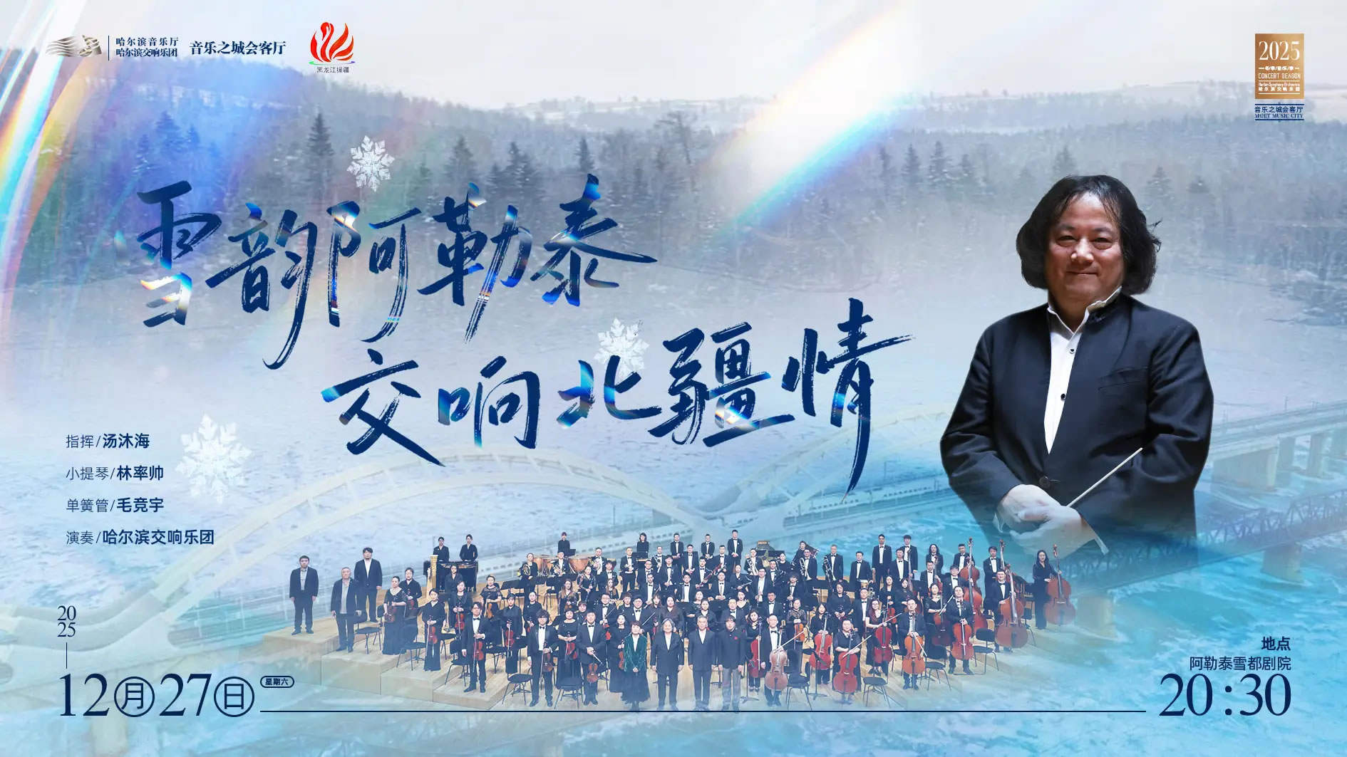 本场音乐会是在黑龙江省援疆前方指挥部的资金支持下,作为新疆维吾尔自治区成立70周年庆典活动的重要组成部分,由黑龙江省文化和旅游厅主办,哈尔滨市文化广播电视和旅游局、阿勒泰地区文化体育广播电视和旅游局承办,国际著名指挥家汤沐海应邀执棒,与百年哈响联袂亮相舞台,以交响之韵为纽带,让两地文化在冰雪时节碰撞交融,奏响新年动人的乐章。