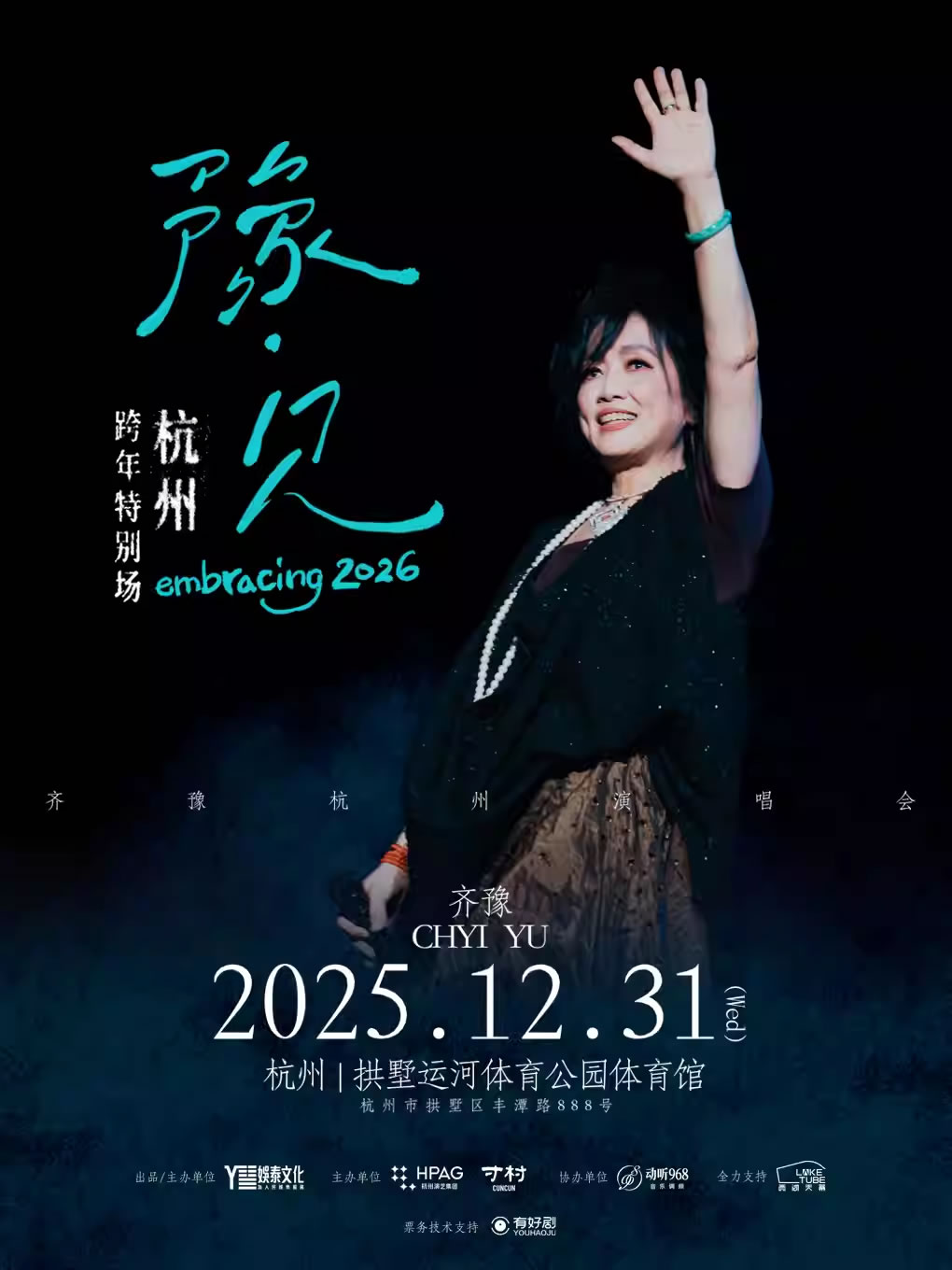 2025年12月31日19:30,在杭州市运河亚运体育公园国球中心·体育馆,让我们与齐豫温暖相遇,用一场跨年音乐盛宴,迎接2026年新篇章。