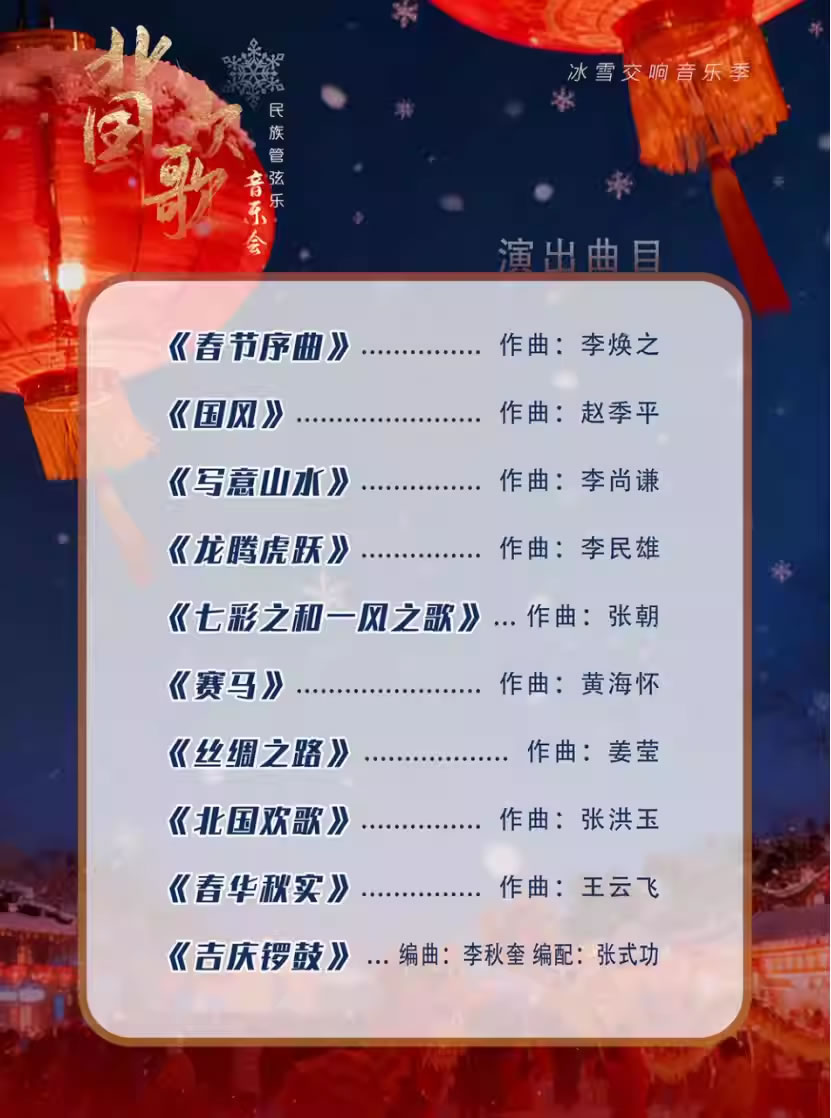 2026年1月3日的“北国欢歌”民族管弦乐音乐会,是一场“东北味”十足的狂欢。《春节序曲》的热闹像东北的春节,鞭炮声、锣鼓声、笑声混在一起;《国风》的旋律像东北的民俗,二胡的悠扬似大秧歌的舞步;《写意山水》的意境像长白山的水墨画,藏着松花江的波浪;《龙腾虎跃》的节奏像东北的舞龙,鼓点的急促像虎的跳跃;《赛马》的旋律像东北的马场,二胡的轻快似马的蹄声;《丝绸之路》的厚重像东北的丝绸之路节点,乐队的齐奏像驼队的行进;《北国欢歌》的核心像东北的民歌,口琴的清亮似小调的悠扬;《春华秋实》的旋律像东北的四季,春天的播种、秋天的丰收都在音乐里;《吉庆锣鼓》的结尾像东北的庆祝,锣鼓声、欢呼声把欢乐推向高潮。这场音乐会像一杯东北的热酒,在冰雪天里温暖着每一个观众——告诉我们,北国的冰雪不是寒冷的象征,而是欢乐的背景。