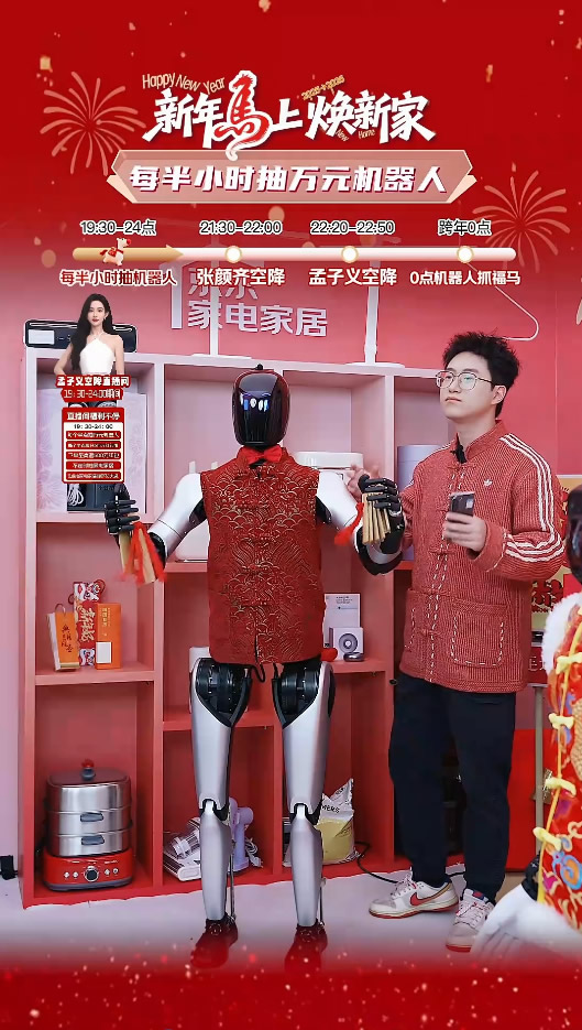 在京东直播间中,智元远征A2和孟子义唱歌接龙,一不小心唱歌“走调”,在线展示高情商;与张颜齐一起送上川味儿祝福,连词成句、即兴说唱、夸夸老己……样样能行。除了展示语言实力,远征A2还现场撰写了“马上有钱”、“抓马”等新春祝福送给大家。灵犀X2则和孟子义、张颜齐斗舞,把直播间的气氛拉满。