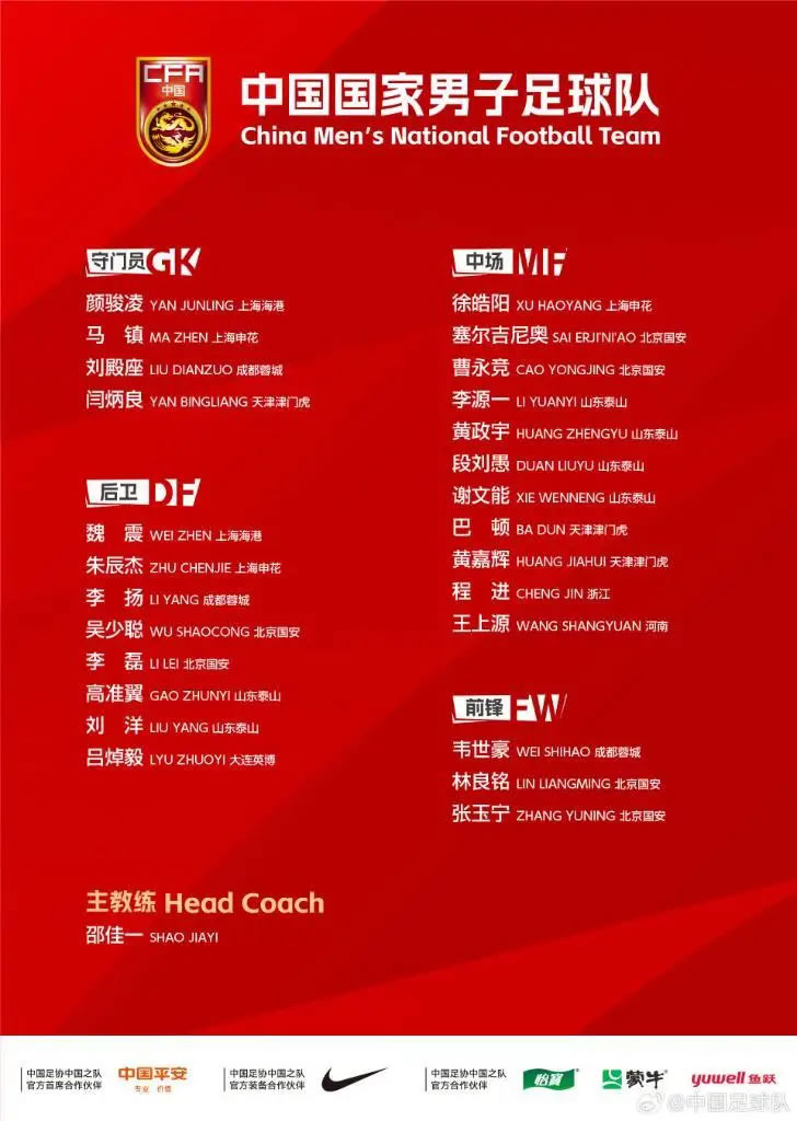 由于U23国足将在1月赴沙特阿拉伯参加U23亚洲杯,本期国足集训并未招入王钰栋、胡荷韬等23岁以下球员。集训名单中,张玉宁、韦世豪、朱辰杰、塞尔吉尼奥等主力球员在列,李扬等四人则是首次入选。此前担任国足队长的王大雷未进入名单。