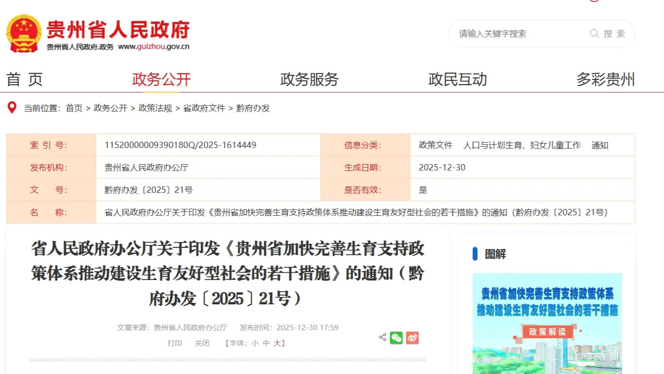 央广网贵阳1月6日消息(记者任振国)日前,贵州省政府办公厅印发《贵州省加快完善生育支持政策体系推动建设生育友好型社会的若干措施》(以下简称《措施》),围绕生育服务、育幼服务、教育住房就业支持及社会氛围营造四个方面,出台14条具体举措,系统支持生育,推动人口高质量发展。