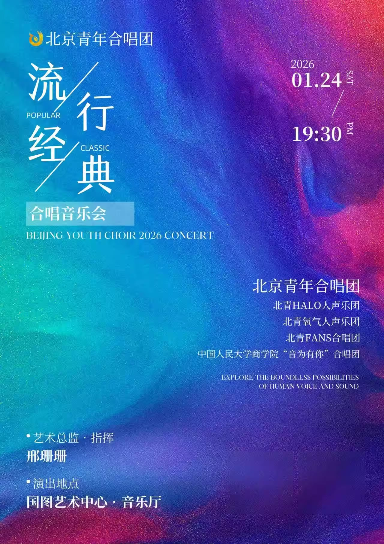 北京青年合唱团成立于2009年,为中国合唱协会会员团、北京市优秀文艺团队。团员由全国音乐院校毕业生及高学历各行业精英组成,是高素养、具探索精神的公益性青年合唱团体。在邢珊珊老师带领下,乐团深耕艺术发展,亮相国家大剧院、国图艺术中心等国内外顶级舞台,成功举办百余场音乐会与大型演出,实力斐然。