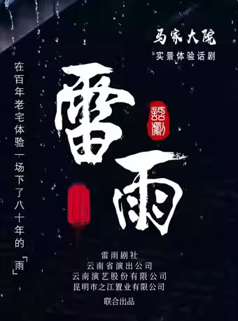 马家大院仿佛一直在等待这部由中国戏剧界曹禺先生创作的话剧《雷雨》降临!大院的青石板,雕梁画栋的四梁八柱,都与《雷雨》中的周公馆气质相近。发现其渊源的国家一级编剧杨耀红,以导演的视觉将这部在中国戏剧舞台上演绎了80多年的名作,与昆明的百年老宅紧密相融。2017年,是中国话剧诞辰110周年的重要历史节点,一群怀着向中国话剧致敬,向经典致敬的有缘人走进了马家大院,让沉睡的大院活了起来。一幢老宅子,让经典更加经典!当国家一级舞美设计师廖宇耕将一场精心设计制作的倾盆大雨从马家大院的上空倾泄而下时,雨滴落在观众的身上,更流入观众心里。从此昆明便有了这一场连续下了几个年头也停歇不了的实景体验话剧《雷雨》。