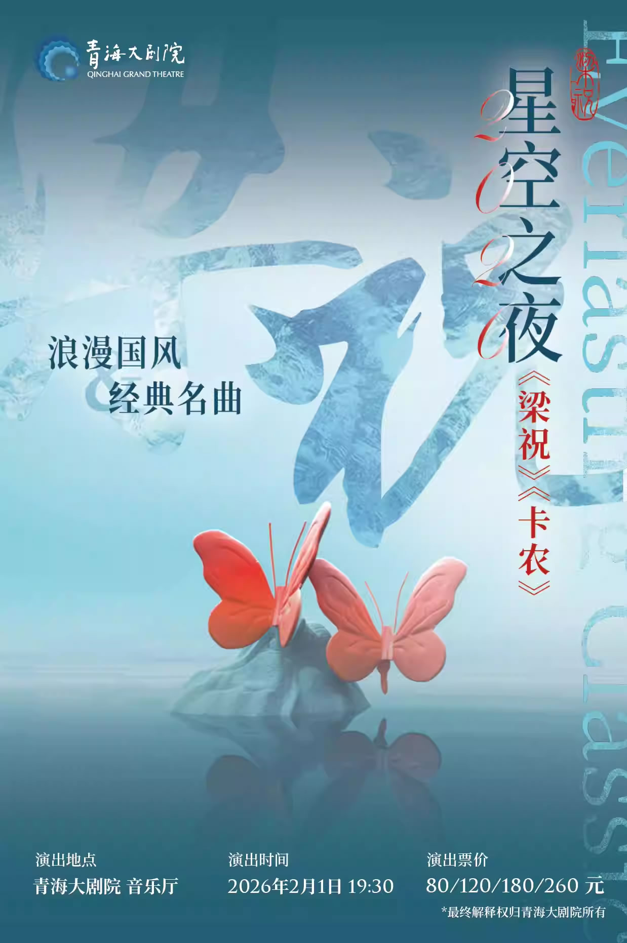 晚风轻抚,带来了一场特别的音乐盛宴——《梁祝》《卡农》浪漫国风经典名曲跨年音乐会。在这个浪漫的季节里,这里将变身为一座璀璨的音乐殿堂,邀请您一同感受古典与现代的完美融合,东方与西方的深情对话。这不仅是一场音乐会,更是一次心灵的触动,一次文化的交流,一次艺术的探索。通过音乐,讲述那些跨越时空的故事,展现那些触动人心的情感,让旋律中找到共鸣,在和声中感受和谐。