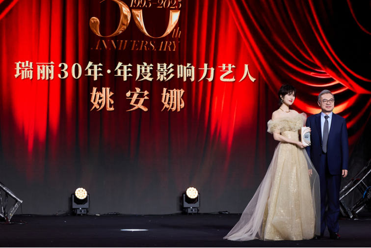 北京《瑞丽》杂志社有限公司董事长陈业进先生为姚安娜颁发瑞丽30年·年度影响力艺人奖项
