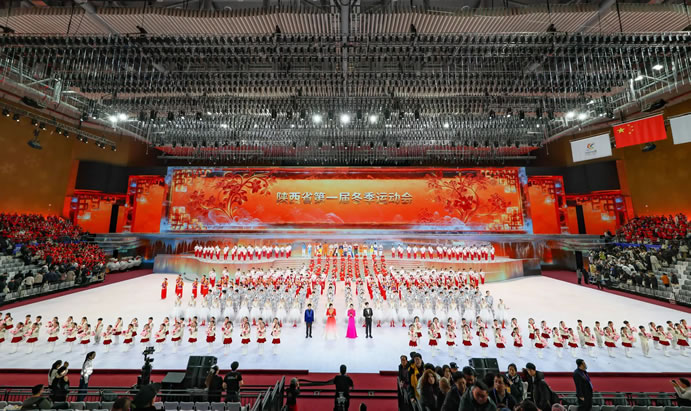随后,一场主题为“驰冰燃雪向新程”的大型文体展演精彩上演。《古脉新承》《沸冬腾雪》《陕耀未来》等篇章相继上演,巨幅LED屏幕、光影效果、演员表演完美融合,以冰雪为韵,向外界展示一个风光旖旎、向新向上的榆林,一个追赶超越、谱写新篇的陕西。