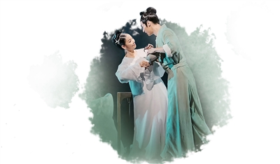 全剧舞台调度在充分考虑叙事和情感的同时,暗合“近实远虚”“散点透视”原则,结合光影、动线构建作品意境。“游园”中,花神与杜丽娘穿梭交织,群舞与之呼应,时而聚拢如繁花簇锦,时而散开如雨丝风片,“膏雨烟浓”“姹紫嫣红开遍”的春日美景跃然眼前。群舞忽又静止,造型高低错落,与舞台上颇有现代意味的金砖粉墙一起,营造出汤显祖原作中“流觞曲水”“太湖山石”等自然意象。观众在品赏一幅幅流动的美景时,油然生出“不到园林,怎知春色如许”的身临其境之感。“写真”“回生”等场次的群舞,也在疏密开合的节奏把控与空间处理中,完成传统与现代审美的对接,意境如梦似幻,为传统经典现代改编提供了新样式。