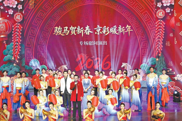 本场演出由北京市委宣传部、北京市委社会工作部主办,首都文化科技集团、北京演艺集团承办。在北京歌剧舞剧院带来的歌舞《欢乐中国年》中,演出拉开帷幕,欢腾的节奏消融了舞台与生活的界限。随后的节目编排张弛有度、情感层层递进。北京曲艺团原创快板《马年说马》以明快节奏传递新春祝愿;琵琶与打击乐《金戈铁马》奏响昂扬奋进的铿锵韵律;中国杂技团国际金奖作品《天边的光-滚杯》则展现出当代杂技的诗意美学与生动意趣。
