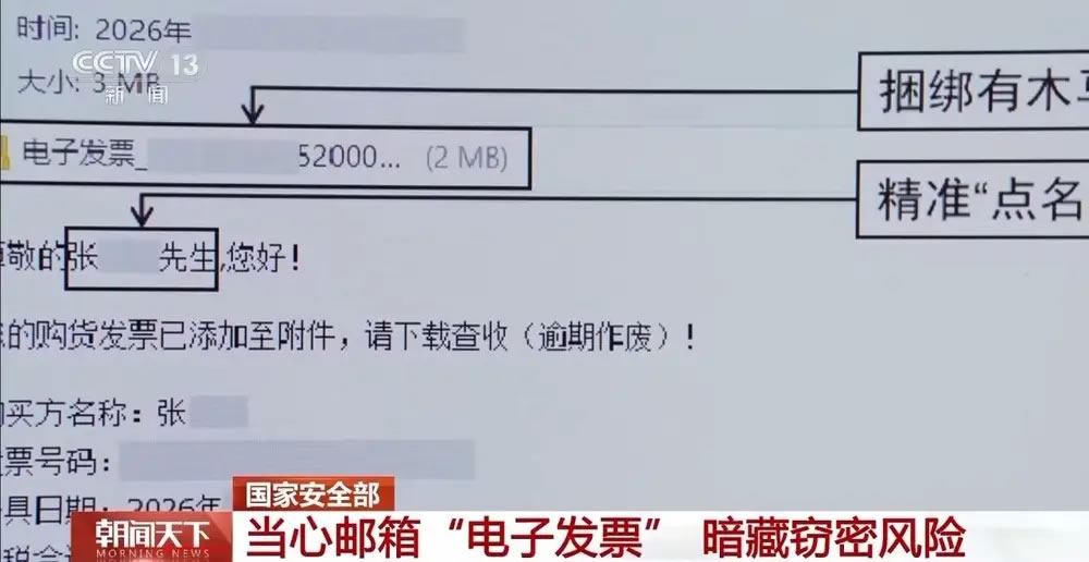 如今,各类电子发票通过邮箱传递越来越频繁,然而,一些看似正常的发票邮件,实则暗藏境外黑客组织窃密木马,一旦点击附件或链接,设备就可能沦为间谍窃密的突破口危害国家安全。国家安全机关近期侦破了此类案件,借此提醒公众高度警惕、严加防范。