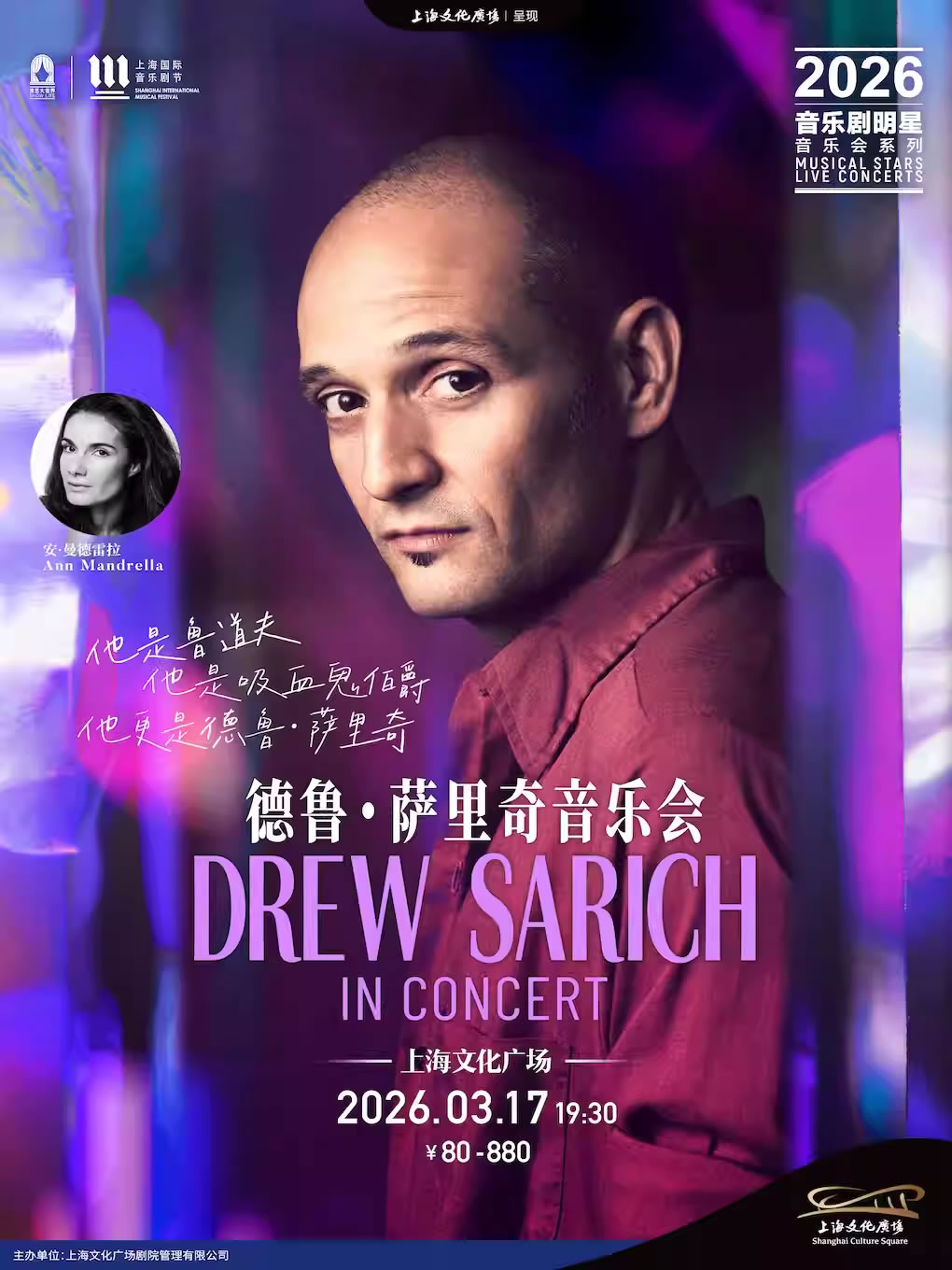 在2019年与2025年两度随《西尔维斯特·里维和他的朋友们德语音乐剧明星音乐会》亮相上海文化广场后,德鲁·萨里奇(Drew Sarich)凭借极具辨识度的嗓音与充满戏剧张力的舞台表现,在中国观众的心中留下了深刻印记。从柏林到百老汇,再到上海,他以一贯的真诚、炽烈与全情投入征服着每一个舞台。他既是迪士尼音乐剧《钟楼怪人》中孤独而深情的卡西莫多,也是百老汇音乐剧《夜访吸血鬼》里优雅而危险的阿尔芒;他曾在伦敦西区与百老汇的《悲惨世界》中诠释过动人心魄的冉·阿让,也曾在《吸血鬼之舞》《万世巨星》《摇滚芭比》等作品中展现惊人的角色跨度与情感深度,是音乐剧舞台上的“全能叙事者”。