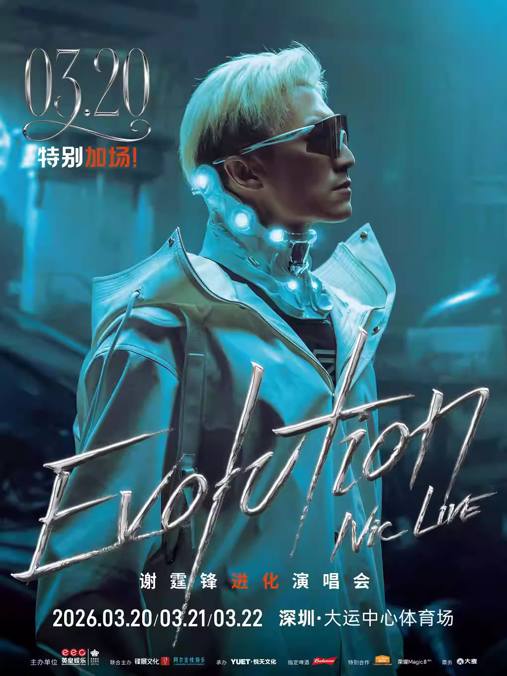 2025年,谢霆锋时隔二十余年再度开启个人演唱会——《Evolution Nic Live谢霆锋进化演唱会》,这场名为「进化」的show刷新了舞台记忆,亦打造了华语乐坛演唱会新标杆。作为首位在香港启德体育园主场馆开个人演唱会的华语歌手,谢霆锋用实力、创意与真心为歌迷们打造了一场独一无二的视听体验,继香港演唱会成功落幕,内巡在万众瞩目与期待下即将开启。