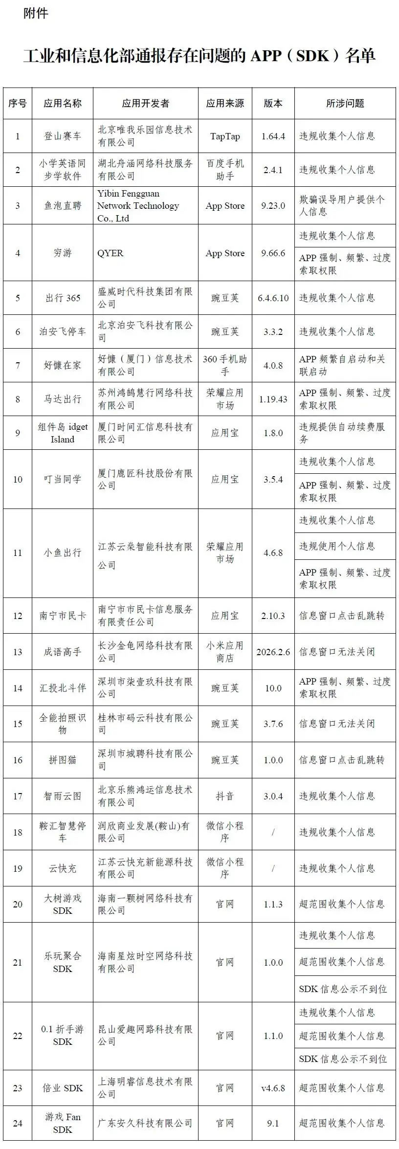 工业和信息化部高度重视用户权益保护工作,依据《个人信息保护法》《网络安全法》《电信条例》《电信和互联网用户个人信息保护规定》等法律法规,持续整治App侵害用户权益的违规行为。近期,工业和信息化部组织第三方检测机构进行抽查,共发现24款App及SDK存在侵害用户权益行为,现予以通报。