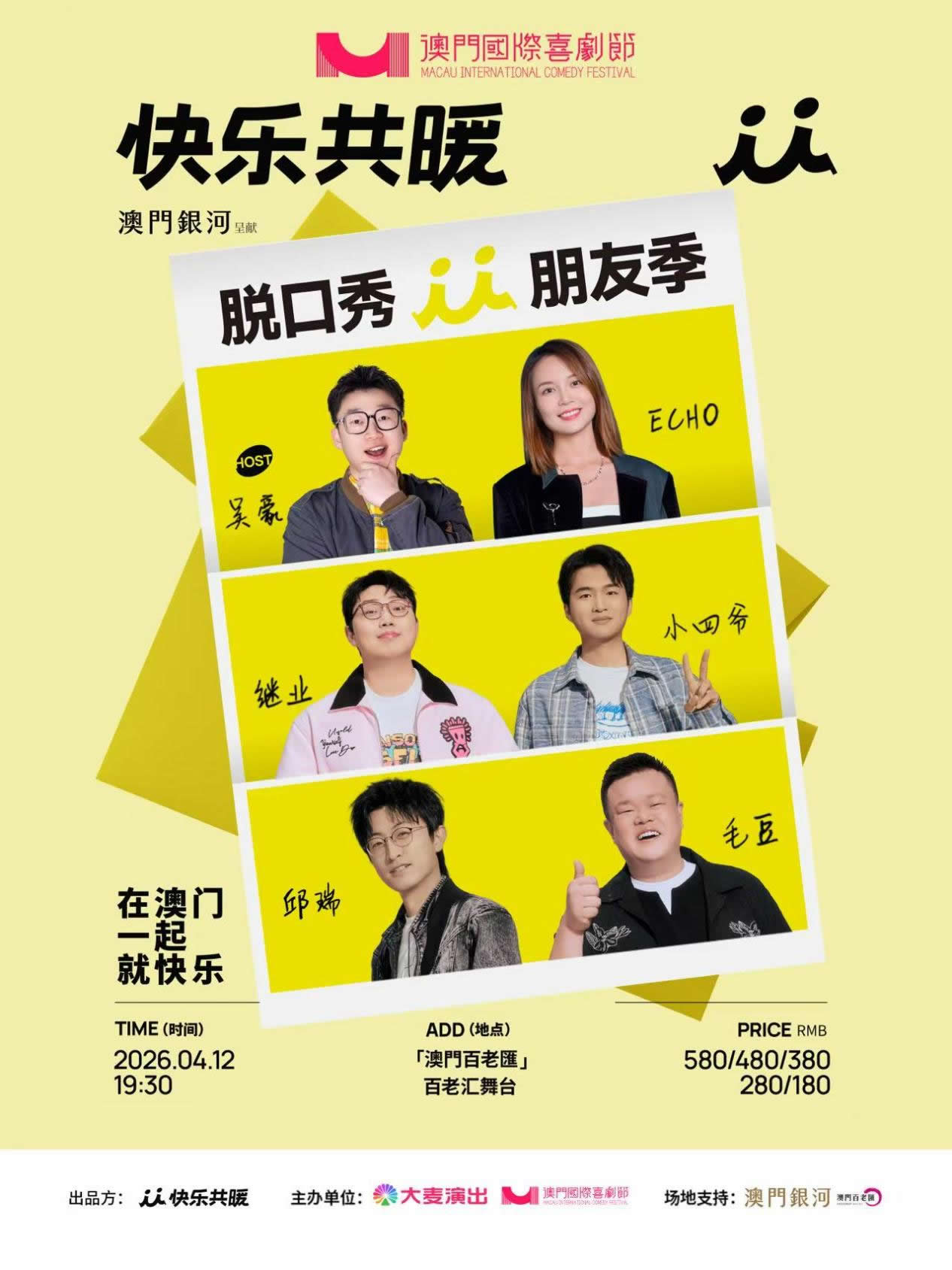 从预热悬念到阵容揭晓,从发起人官宣到电影IP联动,第三届澳门国际喜剧节的官宣节奏紧凑、内容扎实。随着4月9日的临近,更多惊喜正在路上。这个春天,澳门、横琴、大湾区,等你一起大笑。