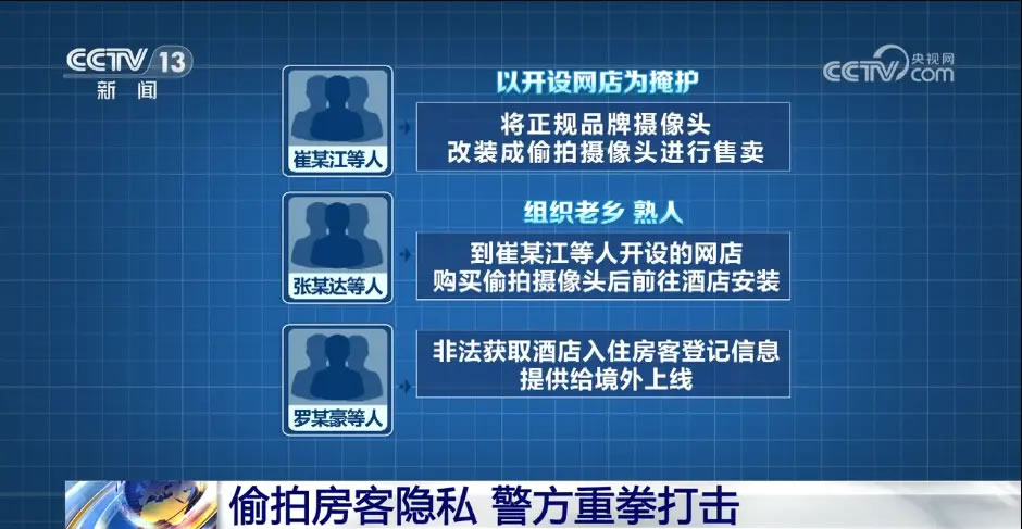 其中,崔某江等人以开设网店为掩护,将正规品牌摄像头改装成偷拍摄像头进行售卖;张某达等人组织老乡、熟人,到崔某江等人开设的网店购买偷拍摄像头后前往酒店安装;罗某豪等人非法获取酒店入住房客登记信息提供给境外上线,协助进行敲诈勒索。