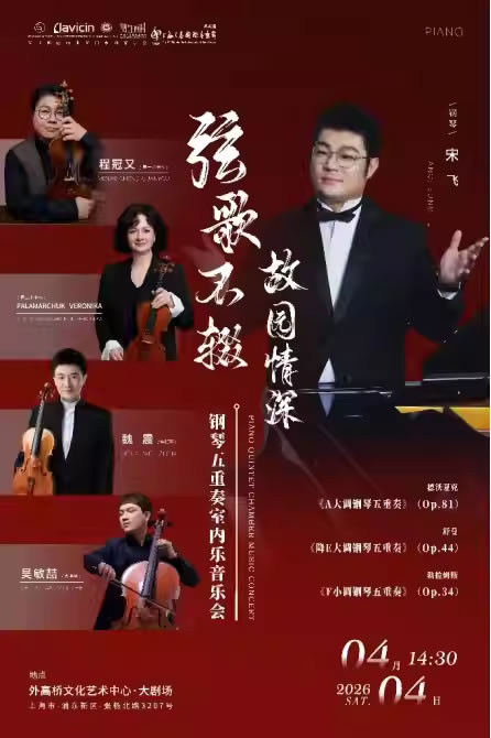 当2026年4月4日的夜色漫过上海外高桥文化艺术中心的穹顶,琴键与弦乐的共鸣将穿透剧场的每一个角落。这场由钢琴家宋飞、小提琴家程冠又携妻子乌克兰小提琴家Palamarchuk Veronika、中提琴家魏震、大提琴家吴敏喆联袂呈现的钢琴五重奏音乐会,注定不只是一场高水准的艺术盛宴——它是一群"31010"开头的上海孩子,跨越山海对故园的深情回望,是刻在身份证里的根脉与藏在琴弦间的乡愁,奏响的最动人的归家乐章。