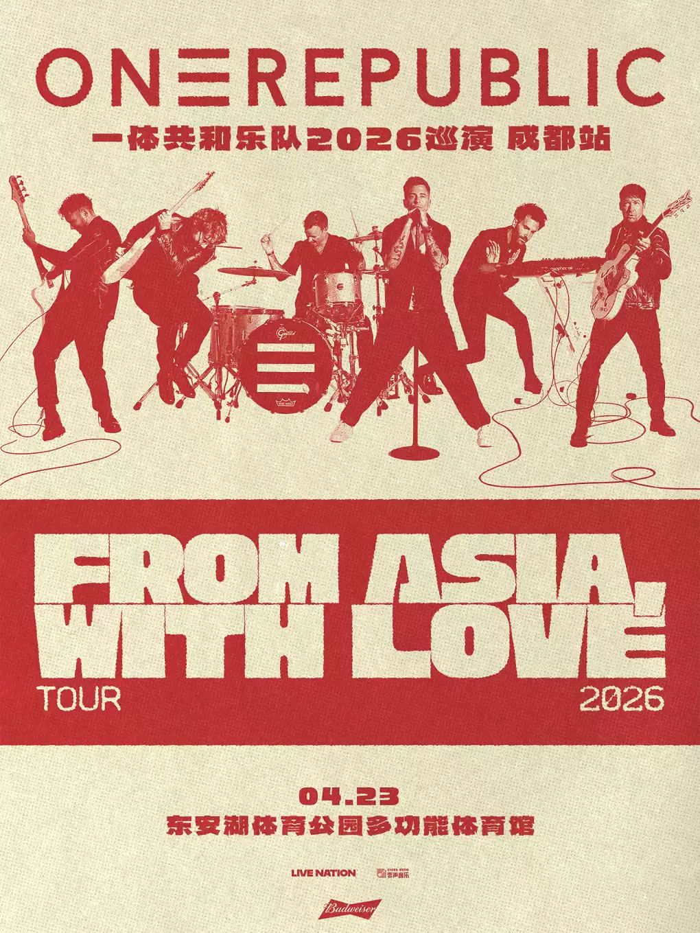 曾获格莱美奖提名的流行摇滚组合一体共和乐队(OneRepublic),即将携备受期待的 “From Asia, With Love” 2026巡演来到成都,演出将于2026年4月23日在成都东安湖体育公园多功能体育馆举办。
