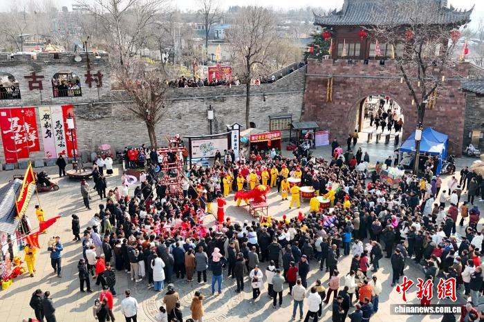 2月17日,河南登封袁桥古村吸引众多游客前来打卡体验。自2024年以来,已有超过50部微短剧在此取景拍摄。(无人机照片) 刘杨迪 摄