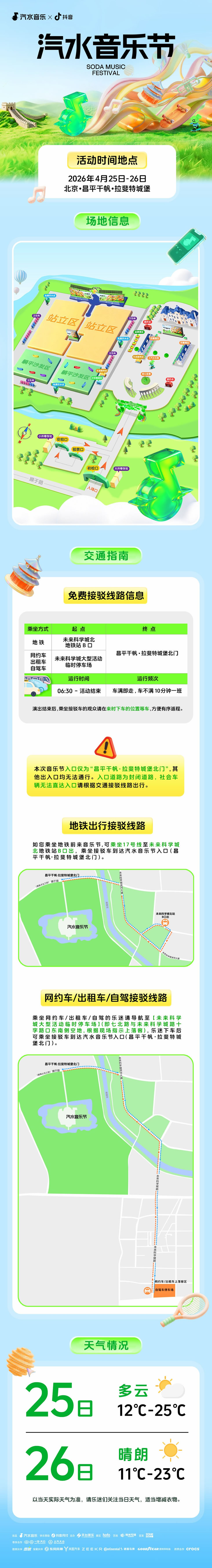 为了确保现场体验的丝滑,主办方发布了贴心观演指南。无论乐迷选择何种交通工具,自驾、地铁、网约车均有接驳车路线覆盖,全心全意护航每一份热爱。