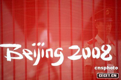 8月2日,北京奥运会开幕式第二次彩排在“鸟巢”进行,武警在体育场围栏后站岗值勤加强安保力量。