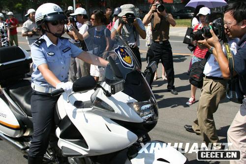 年轻漂亮的女骑警(8月3日摄)。当日,北京市公安局公安交通管理局组织骑警队在北京奥体中心附近进行展示活动,奥运带路队的女骑警和负责巡逻任务的骑警集体亮相,吸引了众多中外媒体。 新华社记者杨光摄 年轻漂亮的女骑警(8月3日摄)。 新华社记者杨光摄 8月3日,参加“中海杯”2008中外摄影家聚焦北京交通摄影大赛的摄影家在拍摄女骑警。