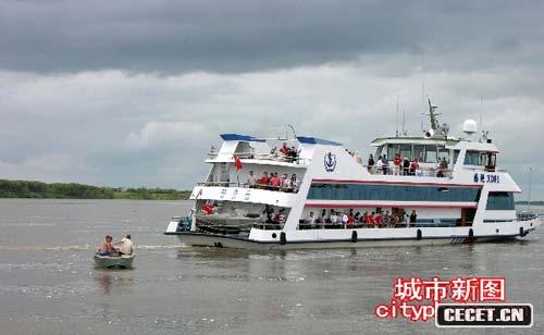 黑瞎子岛边,俄罗斯小船和中国游轮亲密接触。