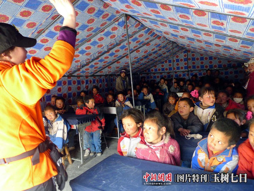 4月19日,青海玉树县第三完全小学的帐篷学堂里,学生们正在上课。中新社发 孙自法 摄