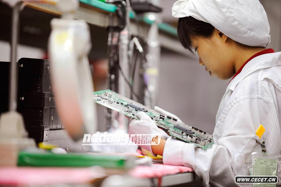 富士康生产线上,一位女工正在检查电路板。-叶飙-文-实习生-陈文才-本报记者-陈以怀-摄