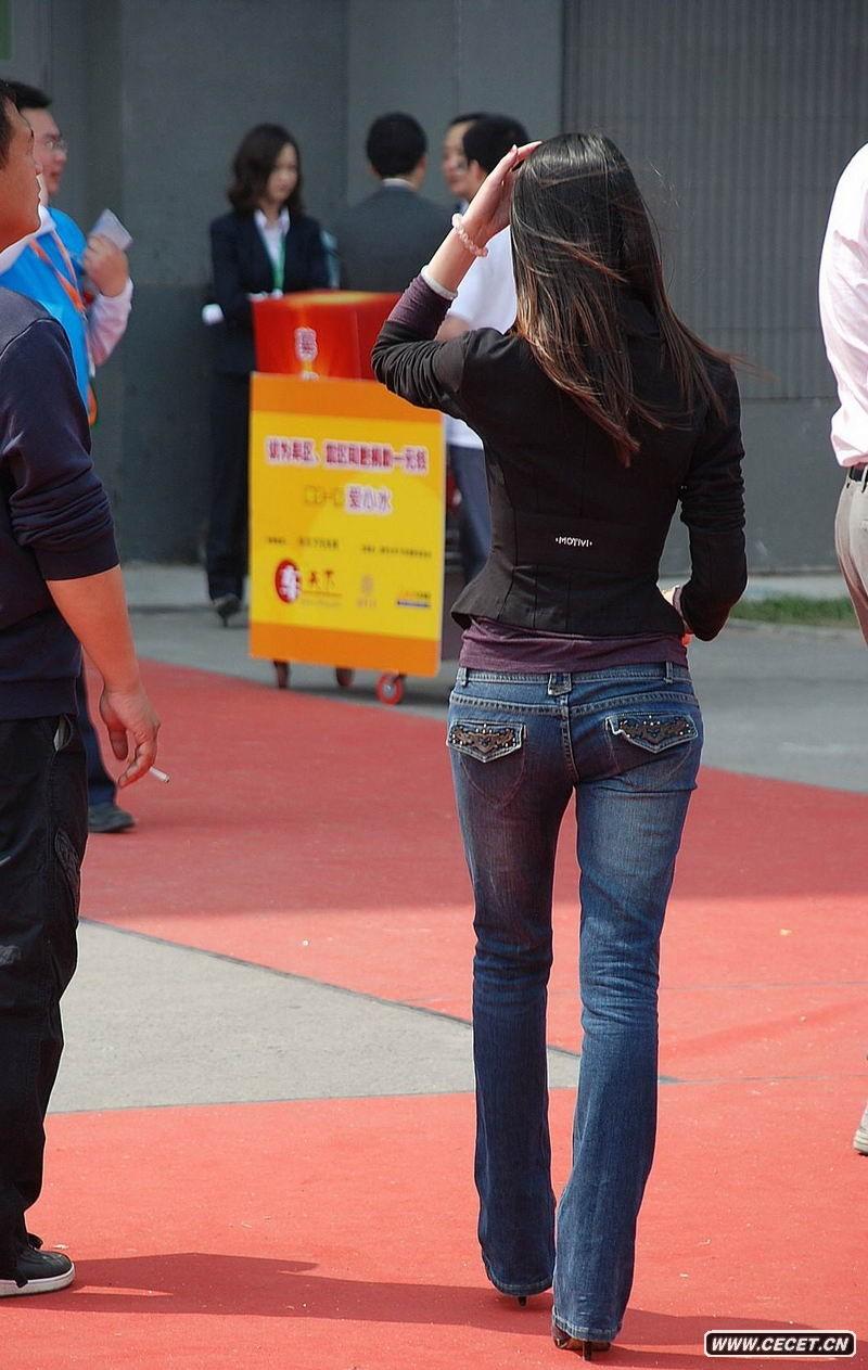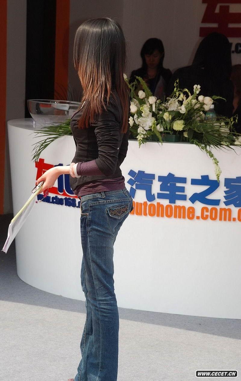 车展上的牛仔裤长发美女
