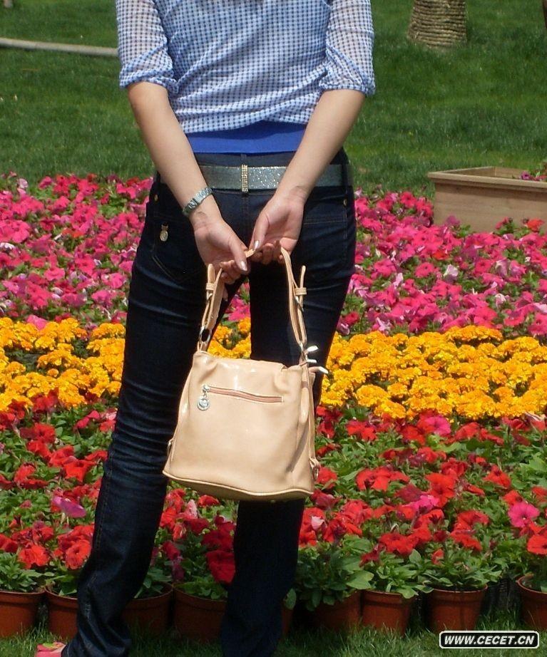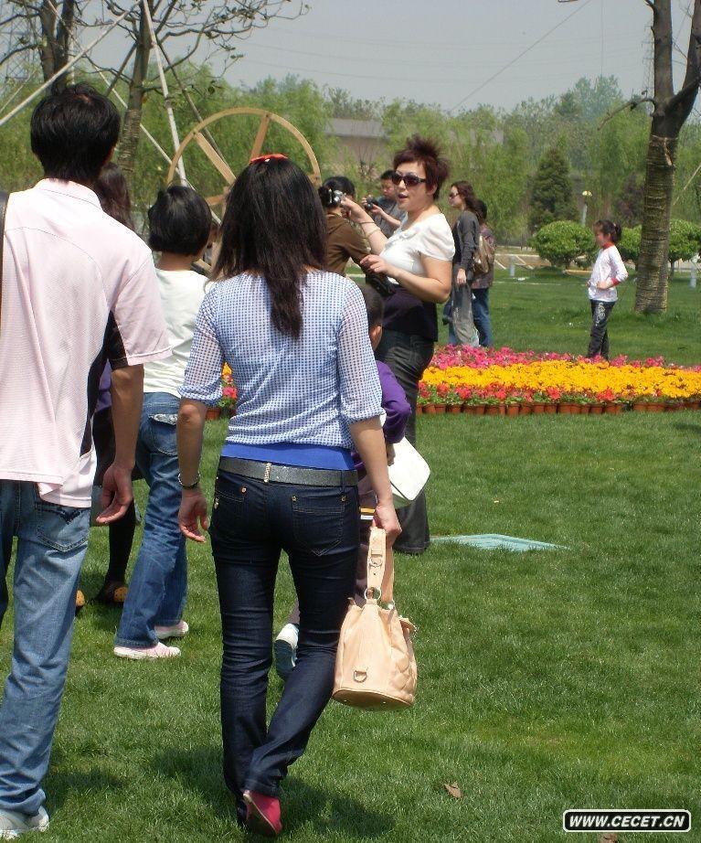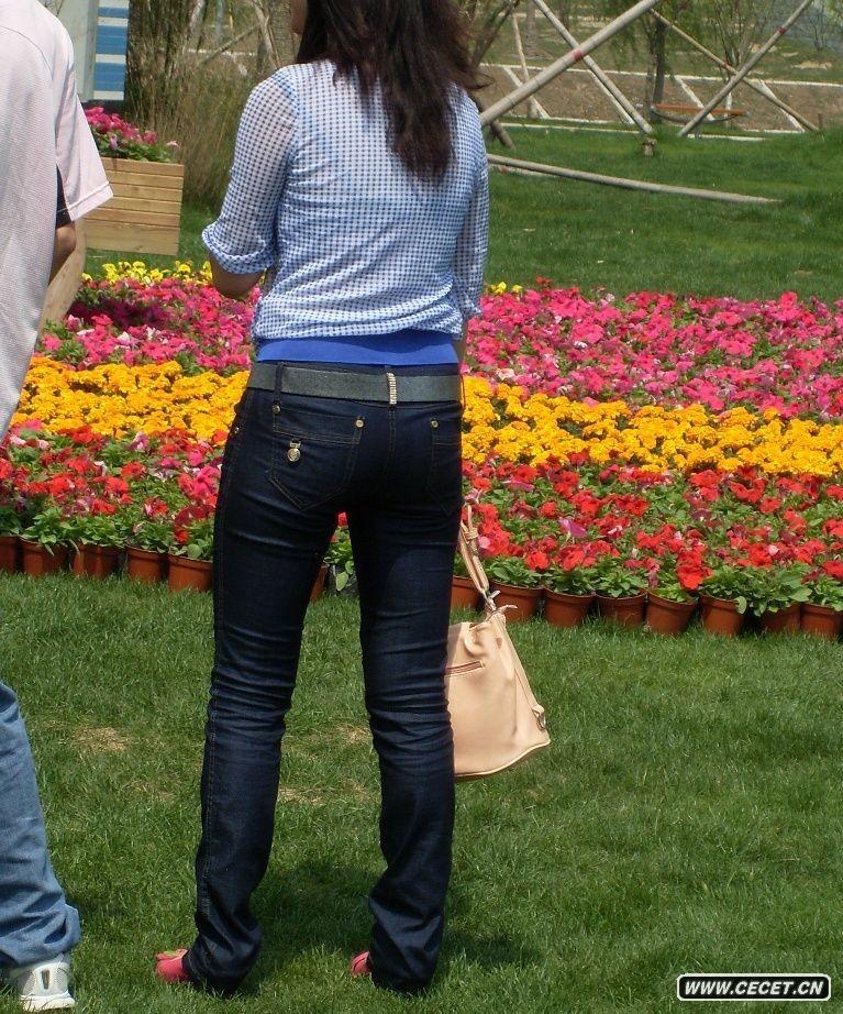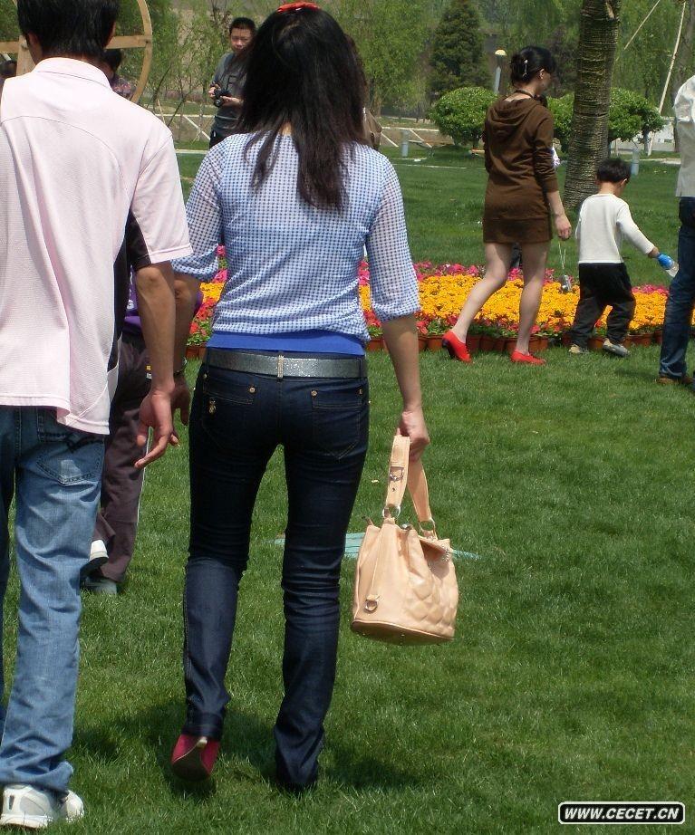 逛公园的蓝色牛仔裤美女