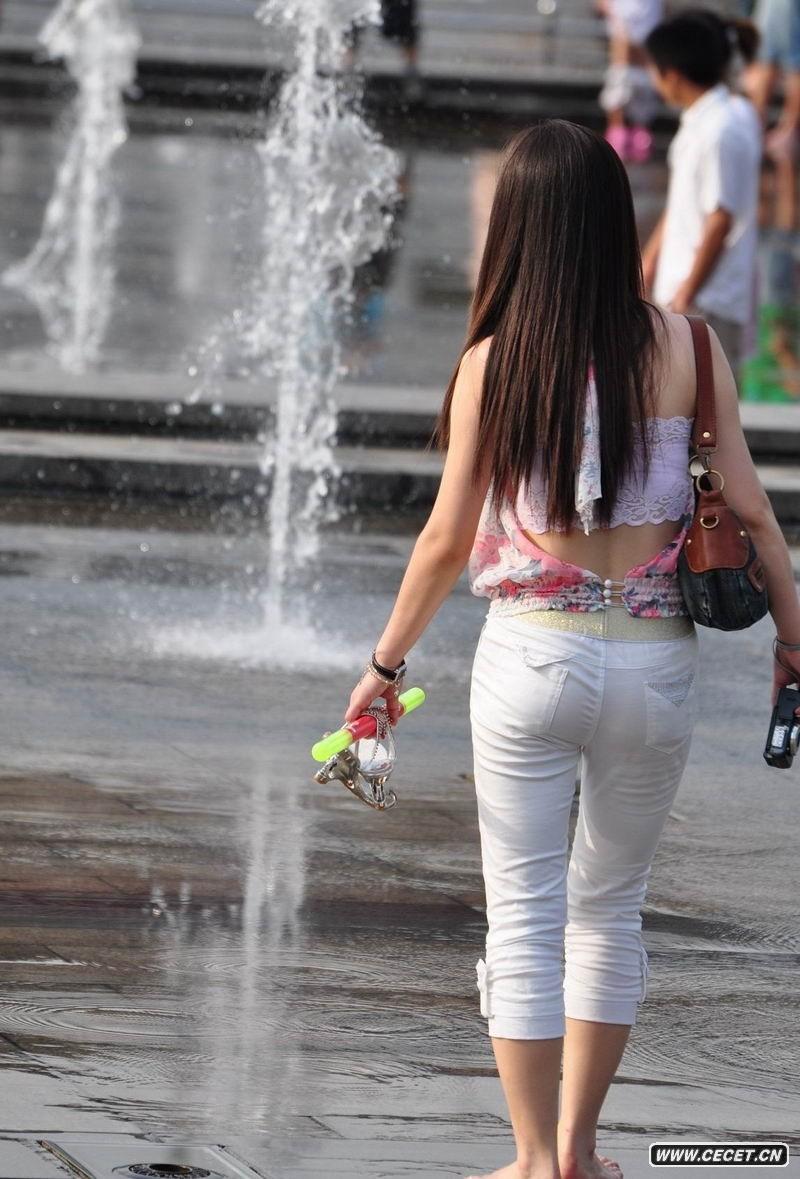 景点抓拍的紧身牛仔裤