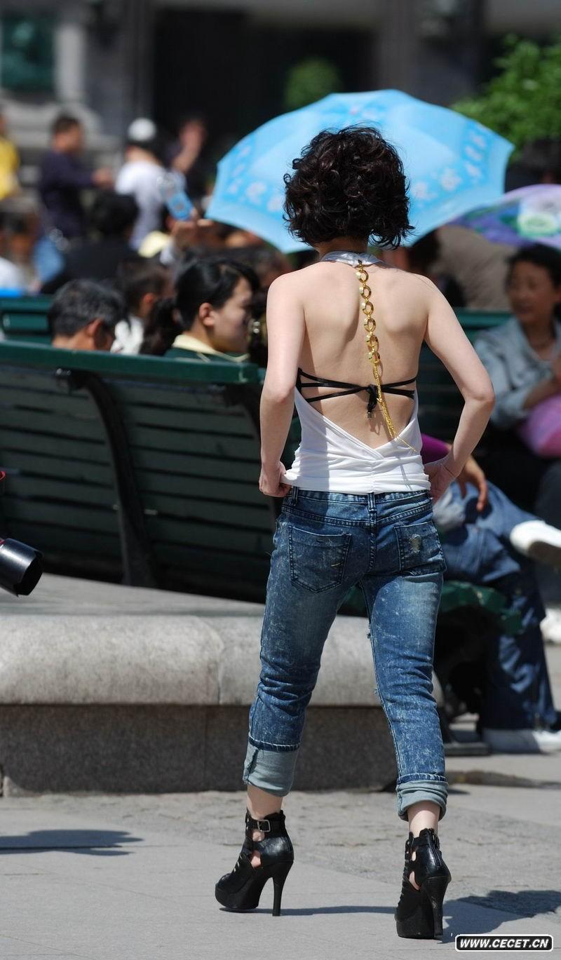 大胆露背装牛仔裤少妇