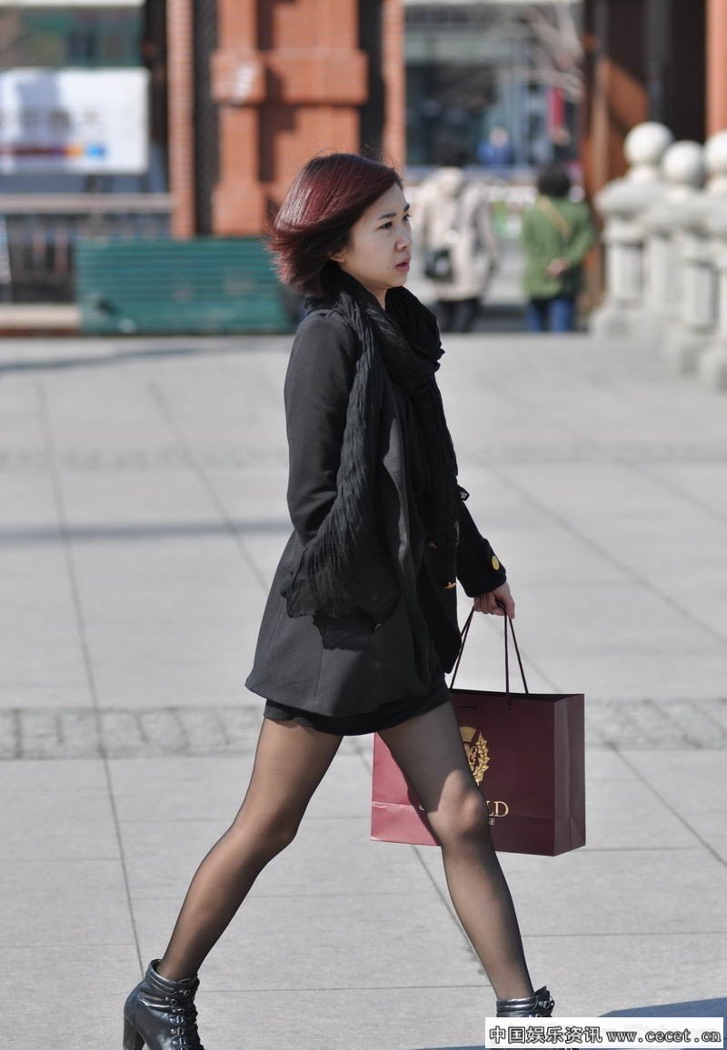 街拍短裤黑色筒袜美女