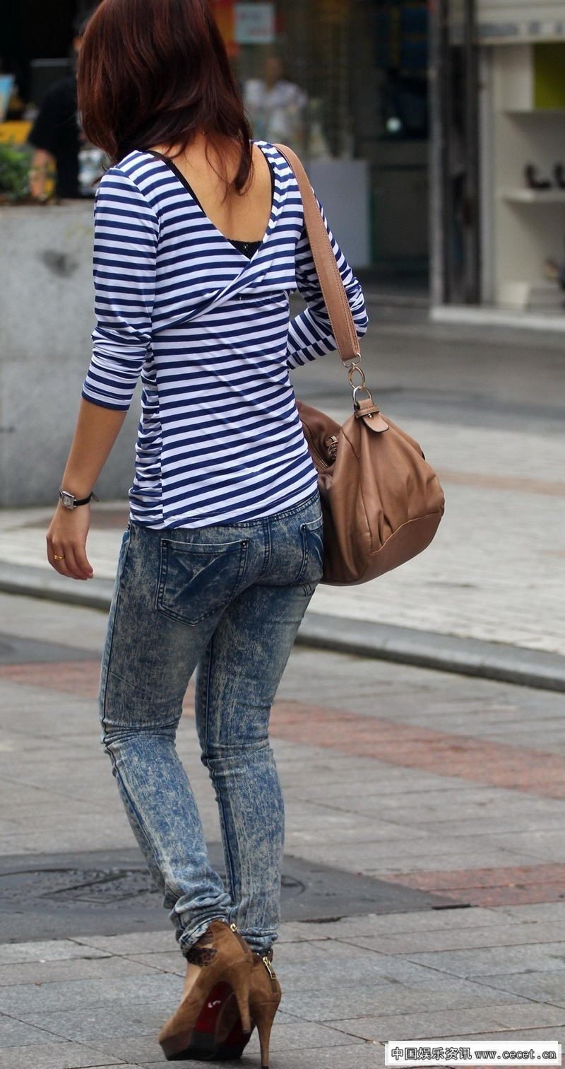 街拍牛仔裤露背装美女
