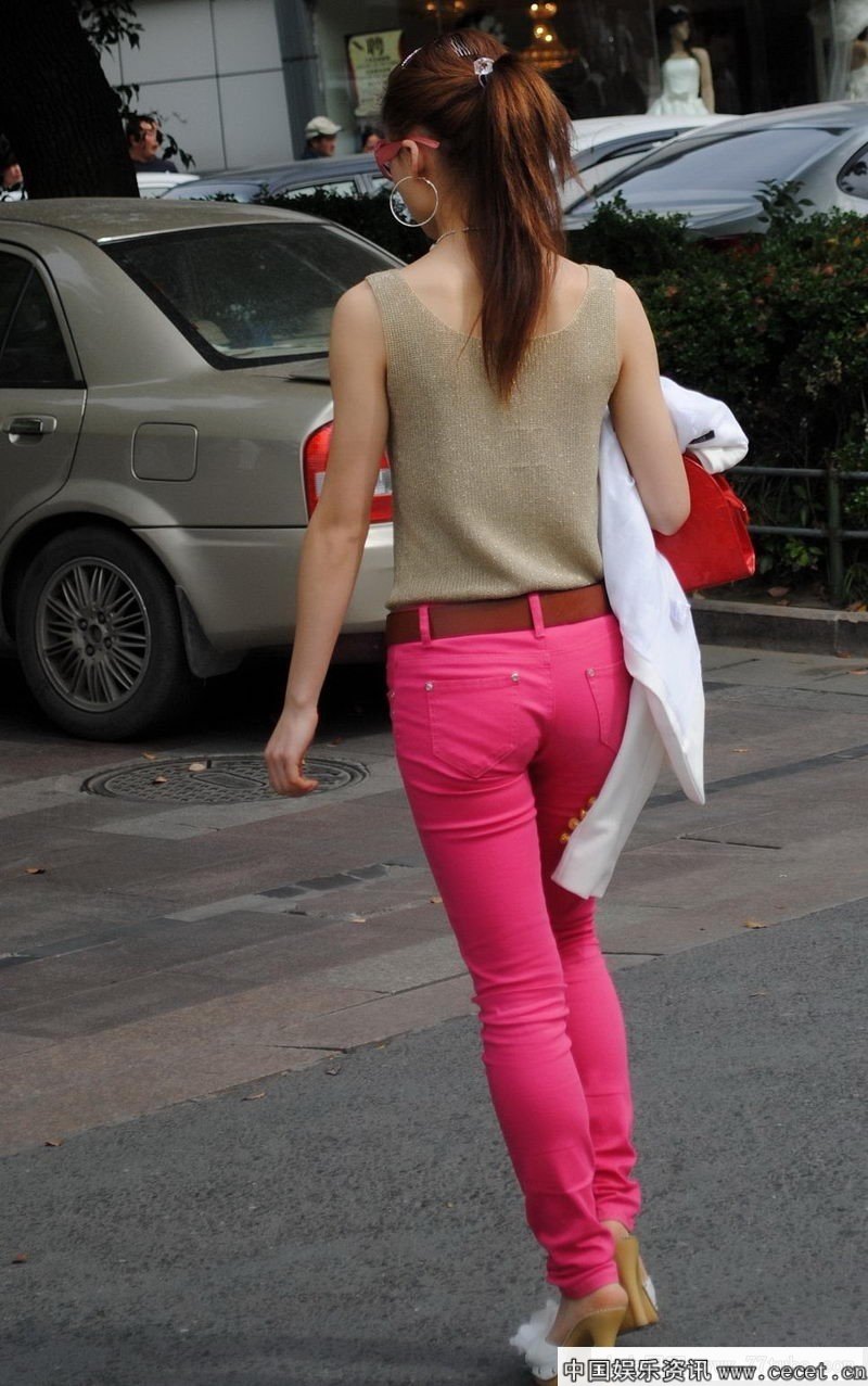 会展路街拍红色牛仔裤美女