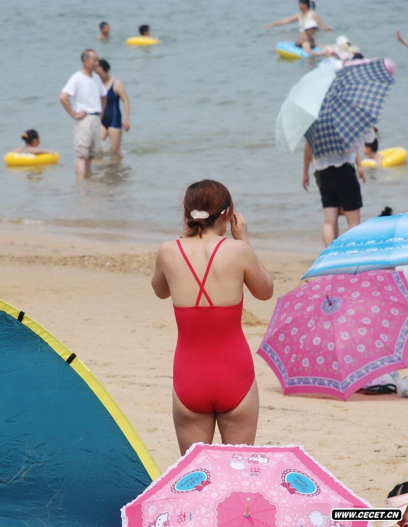 日照沙滩拍的传统式泳装少妇