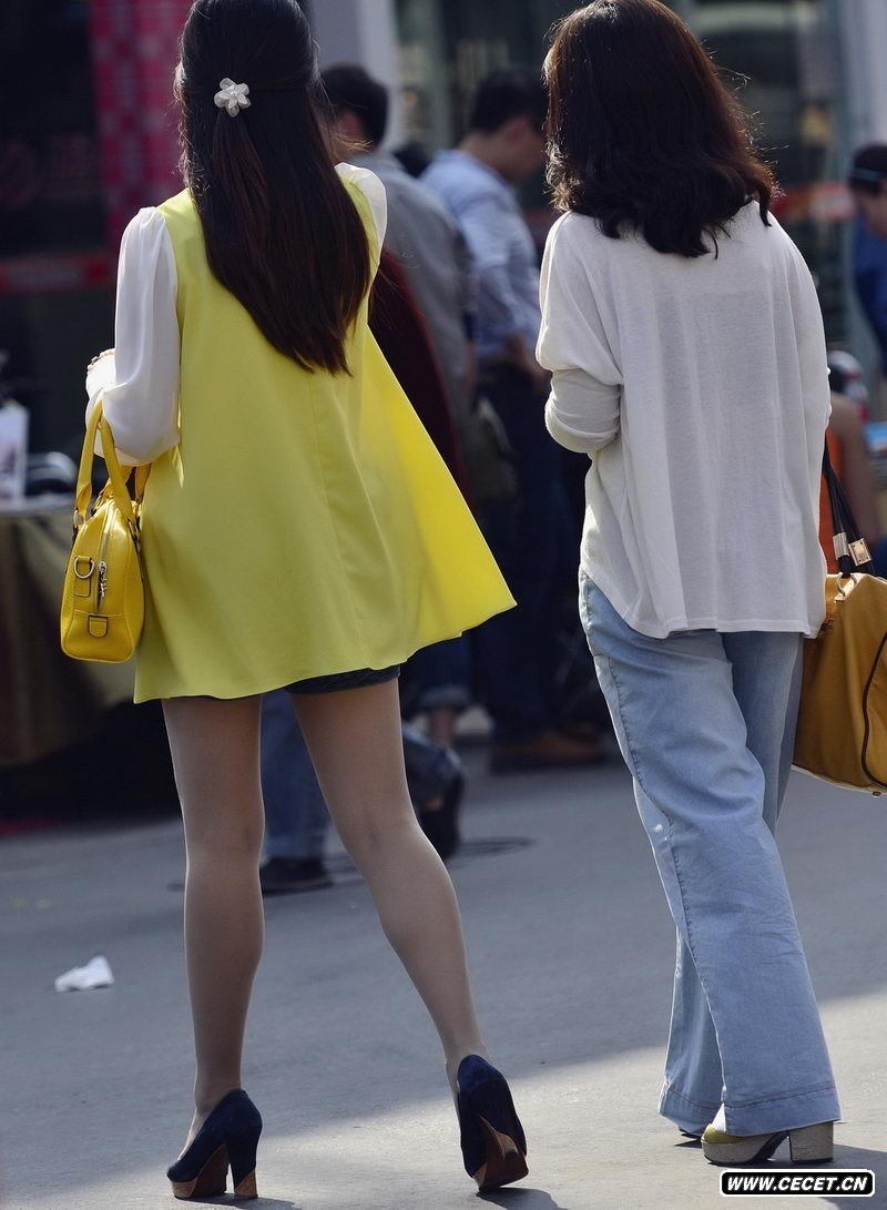 街拍的黄衣白色紧身裤