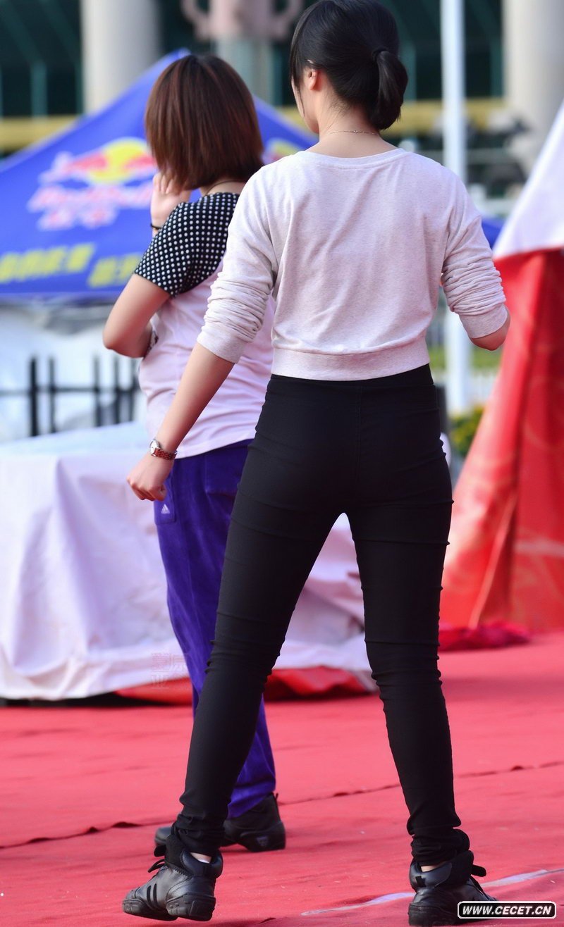 街拍表演节目的黑色紧身裤美眉