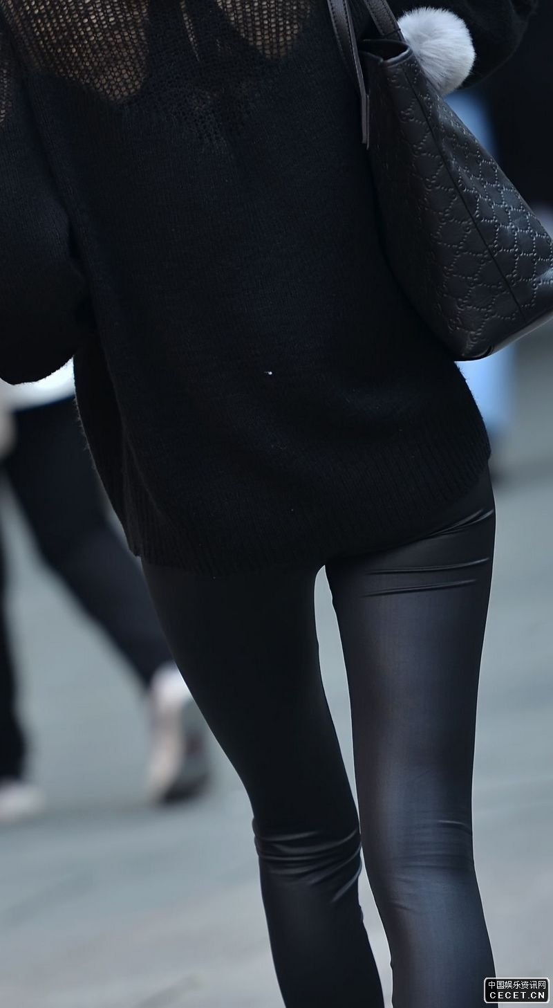 街拍的黑色紧身皮裤美眉