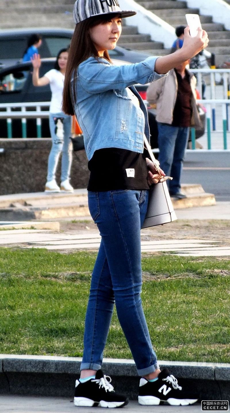 广场上街拍的牛仔裤美眉