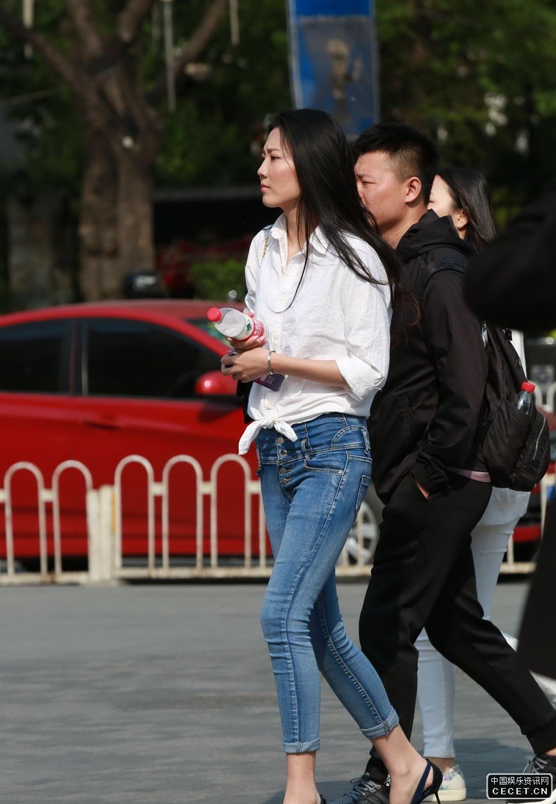 街拍的白衬衫蓝色牛仔裤美女