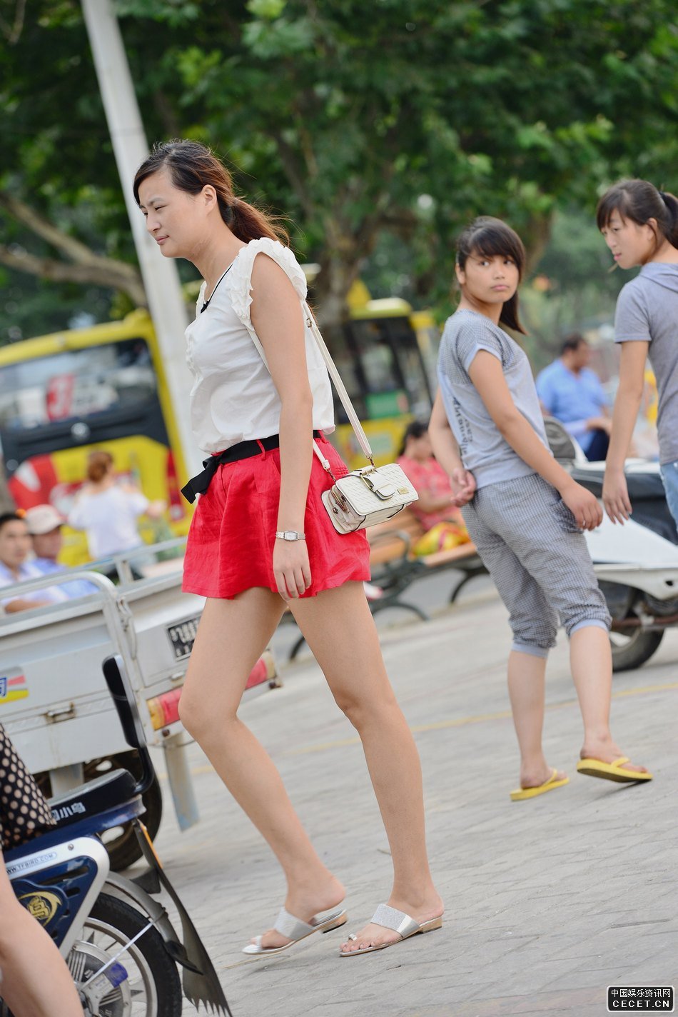 建设西路街拍的红色短裙美女
