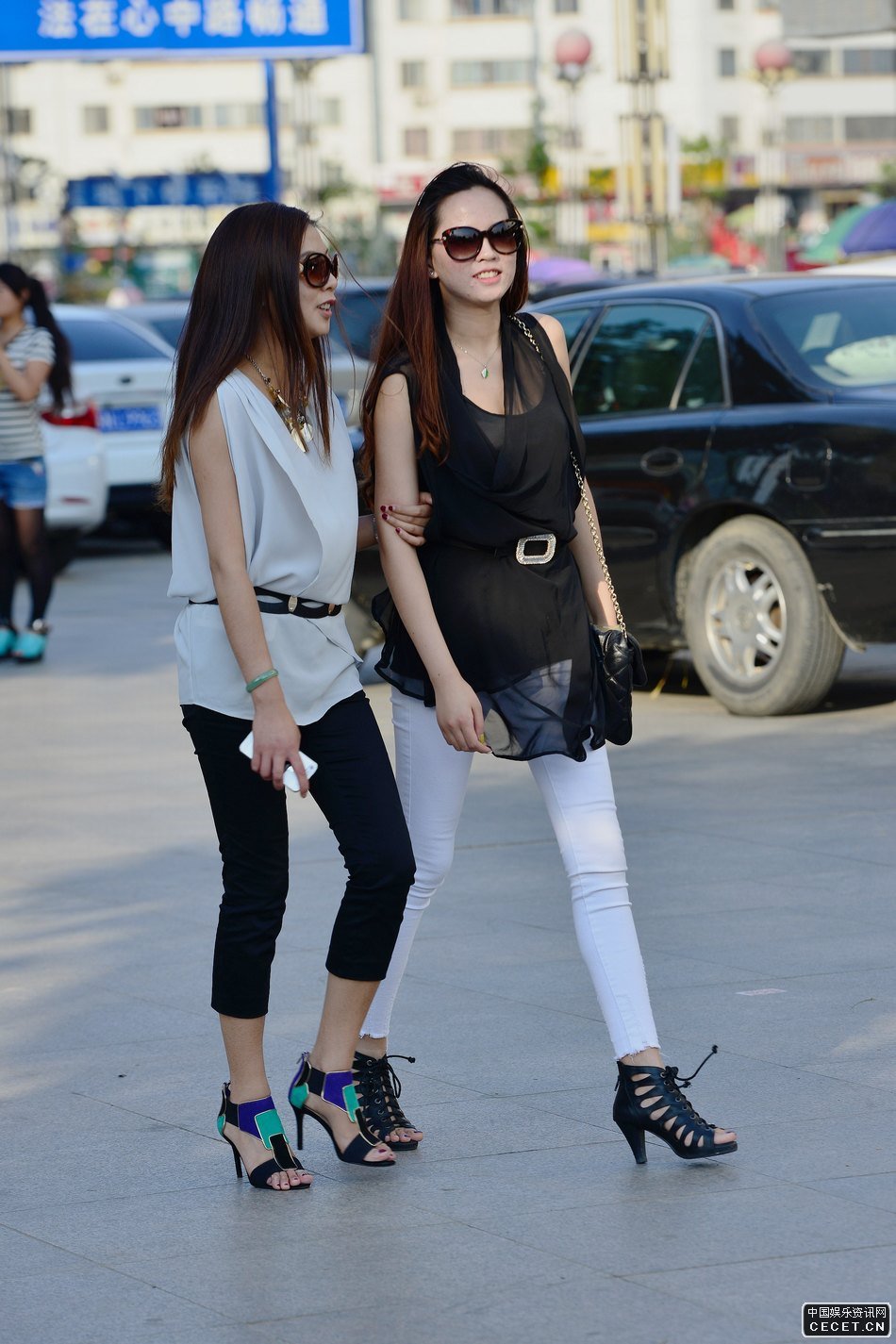 街拍的两个紧身裤长细腿美女