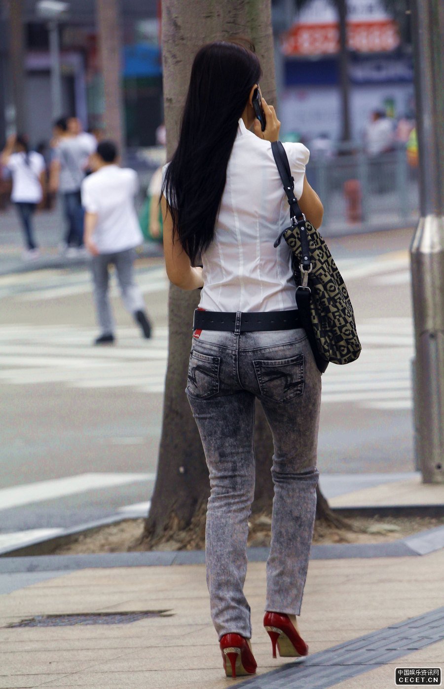 肉感妹子白色衬衫牛仔裤迷人的身影