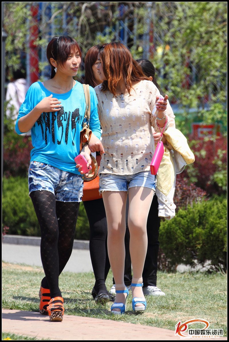 街拍的两个白色热裤清