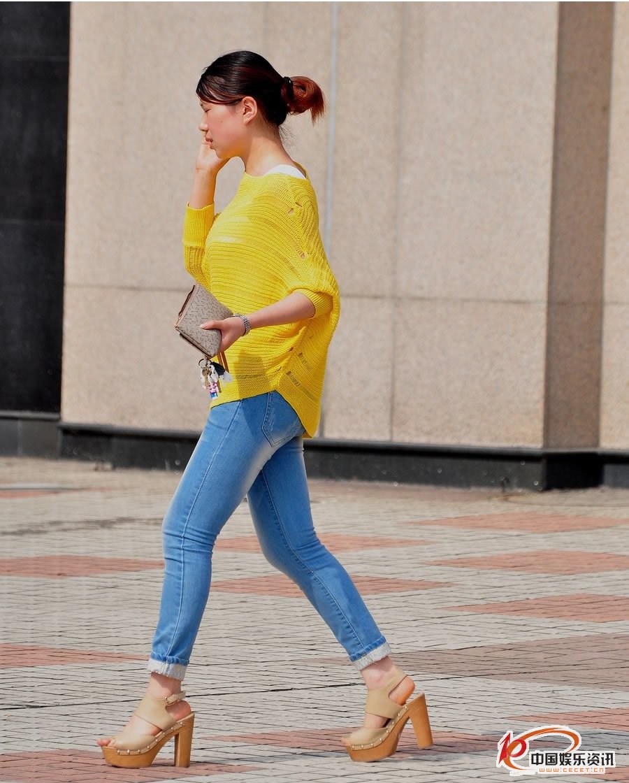 街拍针织蝙蝠衫紧身牛仔裤美女